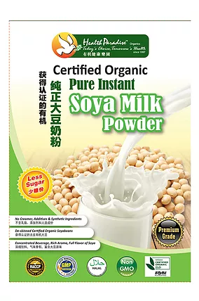 Health Paradise certified organic pure instant soy milk powder (without any liquid added) is not sticky and melts in the mouth, resulting in a pure & concentrated beverage with rich aroma & a full flavour of soy.