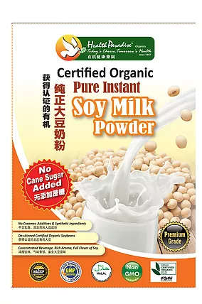 Health Paradise certified organic pure instant soy milk powder (without any liquid added) is not sticky & melts in the mouth, resulting in a pure & concentrated beverage with rich aroma and a full flavour of soy.