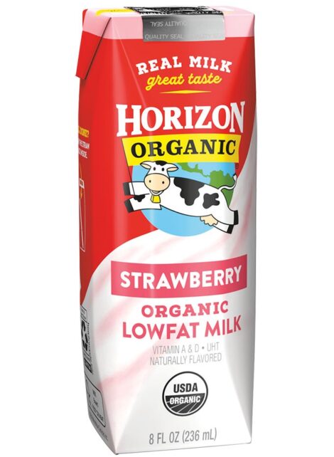 An alternative to juice boxes, these shelf-stable strawberry milk boxes are certified organic & perfect for the lunchbox & on the go. They’re free of artificial flavors or colors.