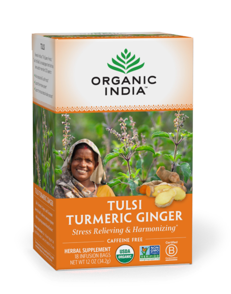 ORGANIC INDIA‘s foundational herb, adaptogenic Tulsi, combined with ginger & turmeric – tastes great iced as well as hot.