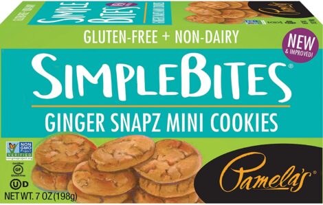 Treat yourself to Pamela’s Ginger Snapz SimpleBites, crispy gluten-free mini cookies loaded with rich chocolate chips. It’s made them small so you can eat many!